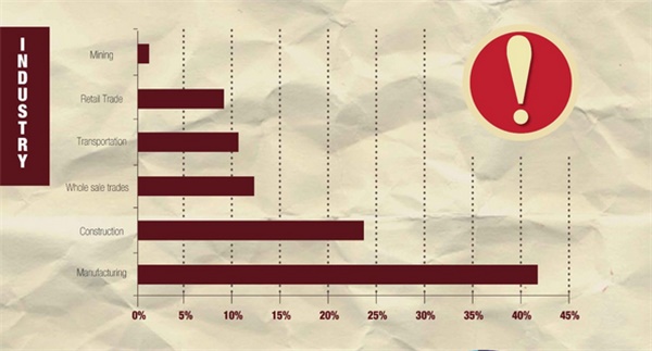 物料搬運(yùn)行業(yè)中發(fā)生最多的行業(yè)是制造行業(yè),其事故發(fā)生率超過了40%。其次,約有24%的事故率來自于建筑行業(yè)。批發(fā)商、運(yùn)輸業(yè)和零售業(yè)所發(fā)生的事故率分別為12%、11%和9%。事故率發(fā)生最低的是采礦業(yè),只占行業(yè)事故率中的2%左右。