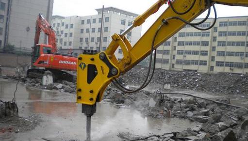 液壓錘屬于沖擊式液壓振動裝置,又稱為破碎器等。在工程上它主要用于對巖石、鋼筋混凝土、瀝青水泥路面及舊建筑物等堅硬物進行破碎、打孔、拆除等作業(yè)。