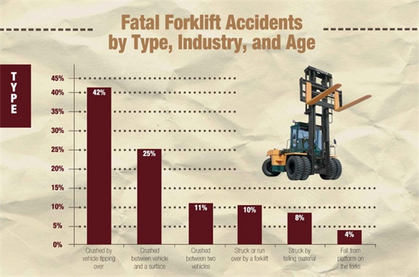 在大量叉車事故中有42%的事故是由叉車側(cè)翻而導(dǎo)致,其中有25%的事故來自于車輛之間的刮蹭,有11%的事故是兩車之間的碰撞,10%的事故是其它運(yùn)行中所發(fā)生的,8%的是從叉車上所掉落的物料而造成的,最后有4%的事故是從平臺(tái)上所掉落的貨叉而造成的。