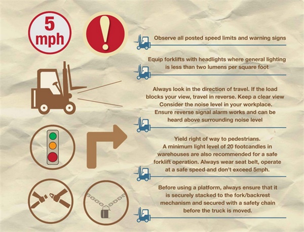 5.當(dāng)叉車移動(dòng)的時(shí)候確保安全鏈和貨叉上的貨物安全的堆放